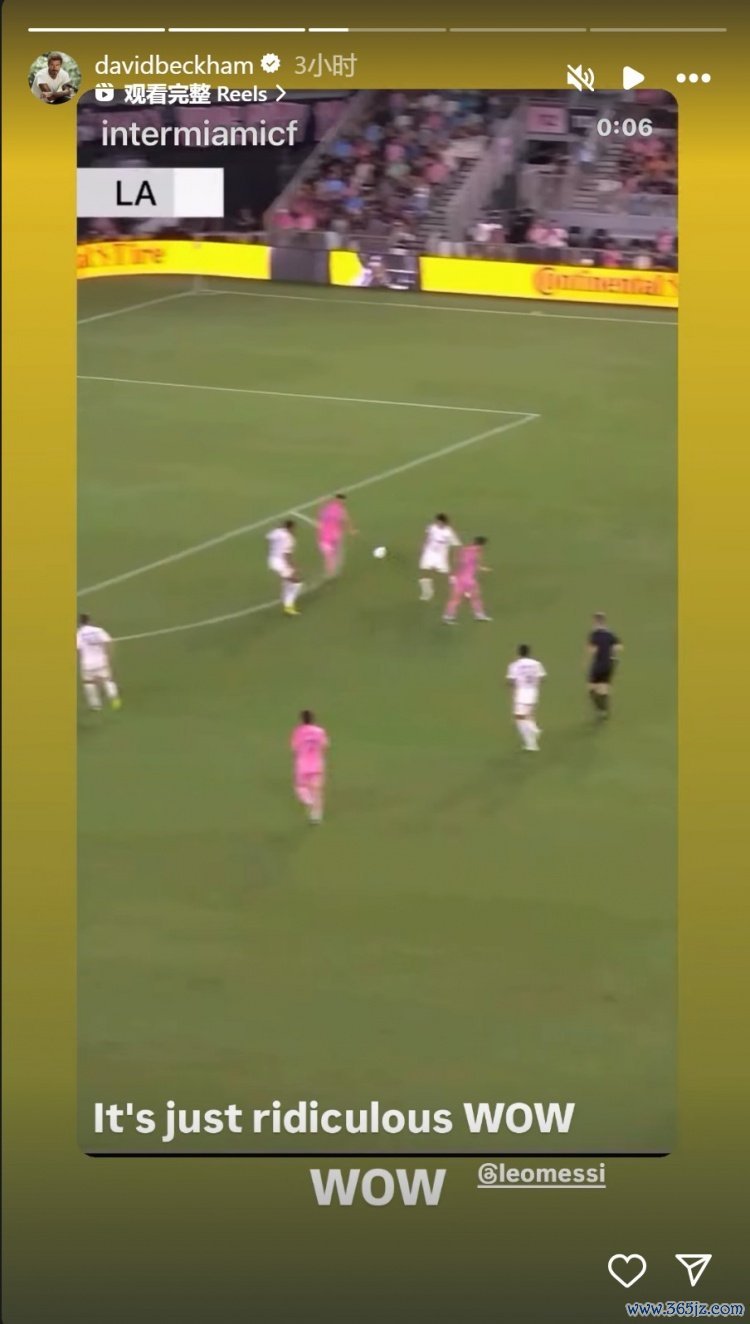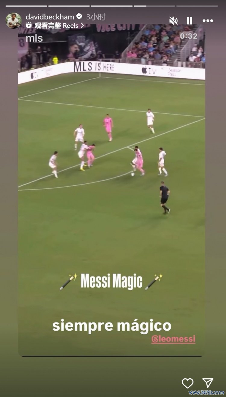 贝克汉姆还转发梅西远射破门的视频,配文:“梅西魔法。始终充满魅力。”