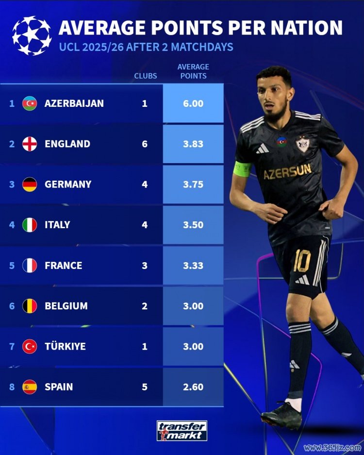 10月2日讯 欧冠第二轮比赛战罢,德国转会市集统计了列国球队两轮事后的平均积分,阿塞拜疆6分最高,英格兰3.83分,德国3.75分。