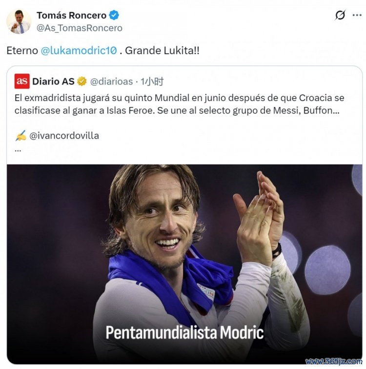 40岁克罗地亚中场莫德里奇将迎来我方的第5届寰宇杯,西班牙媒体《阿斯报》主编、皇马球迷龙赛罗转发相干新闻,配文:“不灭的莫德里奇,伟大的卢卡(莫德里奇)!”