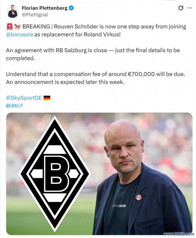媒体指出,门兴成心遴聘萨尔茨堡总监施罗德,让其成为俱乐部的新任总监,以替代离任的维尔库斯,门兴接近与萨尔茨堡罢了左券,只剩临了细节有待敲定,抵偿金约为70万欧,瞻望本周晚些本领官宣。