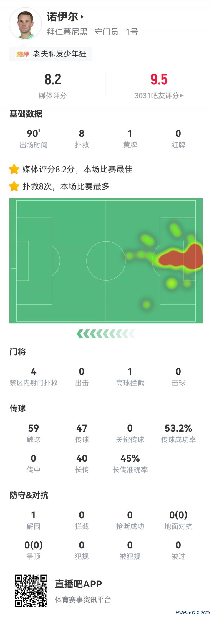 赛后评分机构Sofascore晒出了两位门将的评分,诺伊尔8.2分,库尔图瓦8.0分。