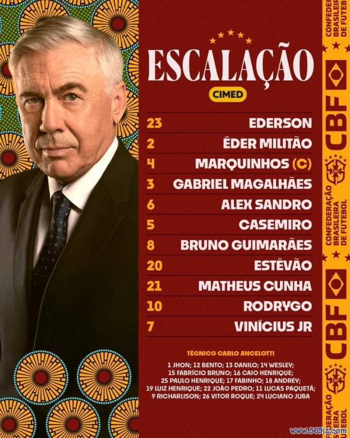 巴西首发:23-埃德松、2-米利唐、4-马尔基尼奥斯、3-加布里埃尔、6-桑德罗、5-卡塞米罗、8-吉马良斯、20-埃斯特旺、21-库尼亚、10-罗德里戈、7-维尼修斯