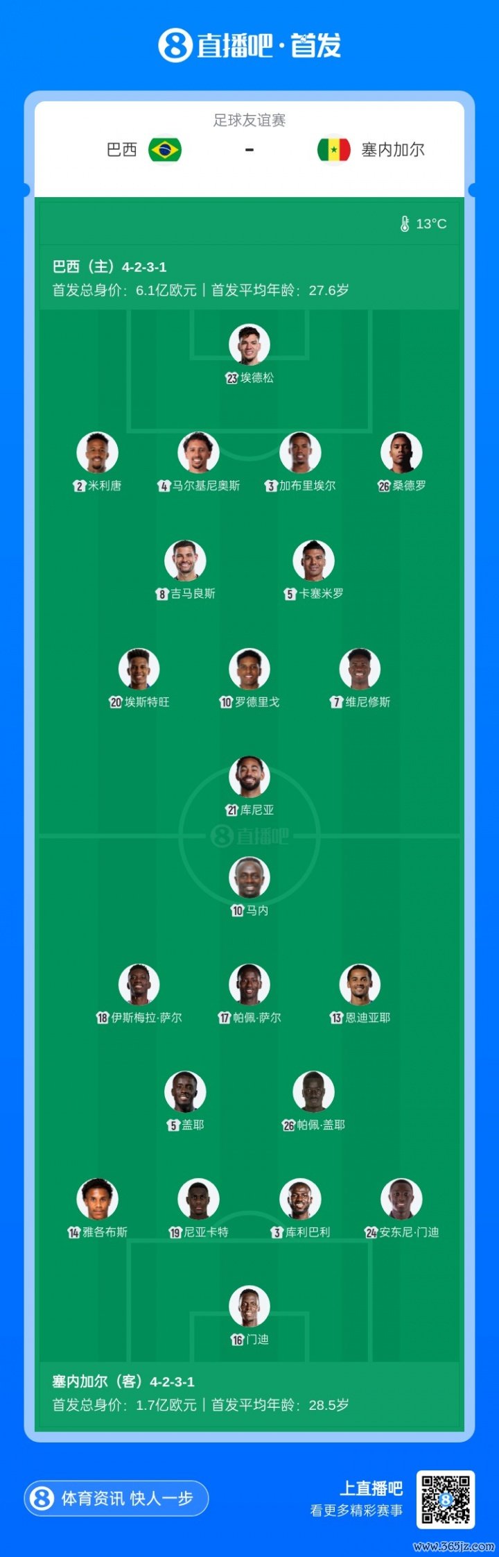 11月15日讯 北京时期11月16日凌晨0:00,足球友谊赛,巴西vs塞内加尔。本场比赛将在阿森纳主场酋长球场举行。赛前两边也曾公布了首发气势。【巴西方面,罗德里戈、维尼修斯先发,加布里埃尔在俱乐部主场首发登场;塞内加尔方面,马内先发,杰克逊替补。】