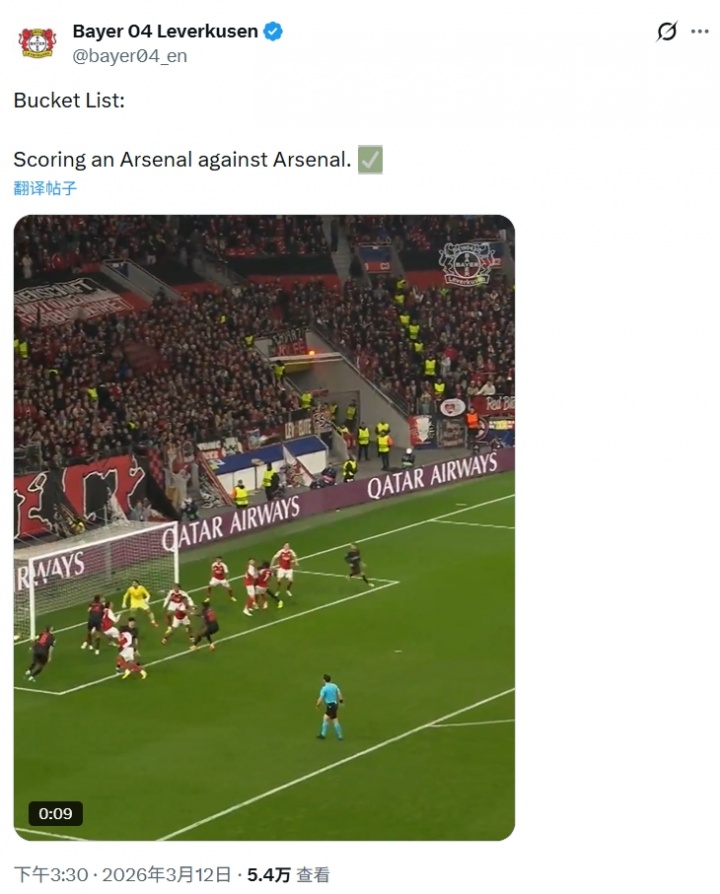 药厂社媒晒出安德里希破门视频,并配文:‘愿望清单:对阵阿森纳时攻入一粒阿森纳式进球✅’。