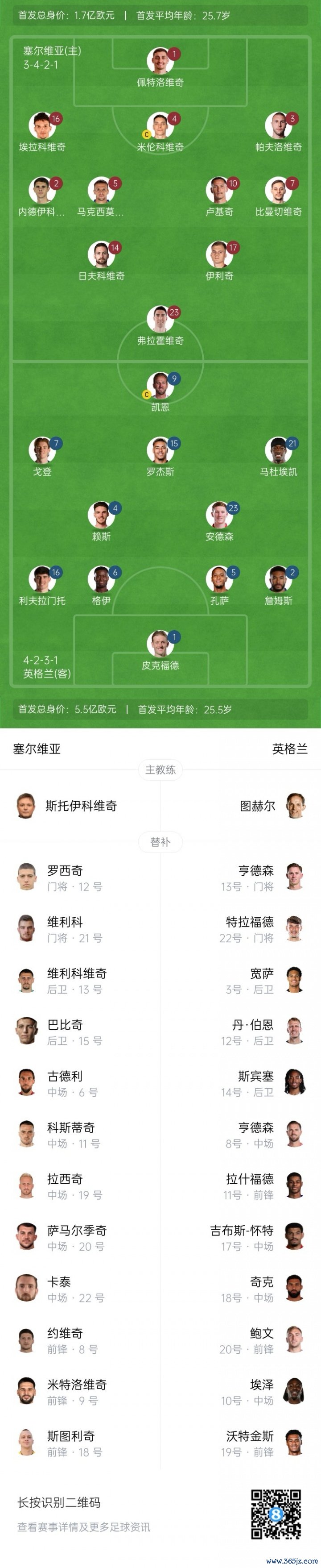 英格兰活着初赛已得益4连胜,塞尔维亚也3场2胜1平保抓不败。