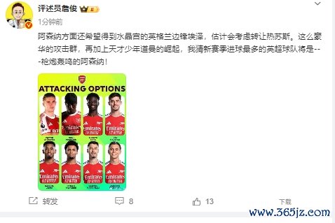 07月29日讯 闻明磋商员詹俊在个东谈主社媒上点评了阿森纳新赛季的锋线情况。