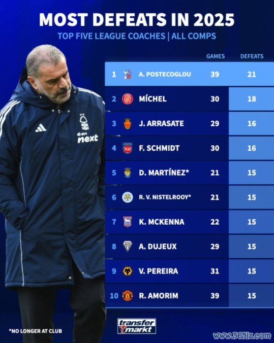 直播吧10月9日讯接替努诺成为诺丁汉丛林主帅后,波斯特科格鲁未能提高球队推崇,反而让球队进一步堕入泥沼。凭据德国转会市集的统计,波斯特科格鲁是五大联赛本年输球最多的主教练,达到了21场,而曼联主帅阿莫林以15场并排第4。