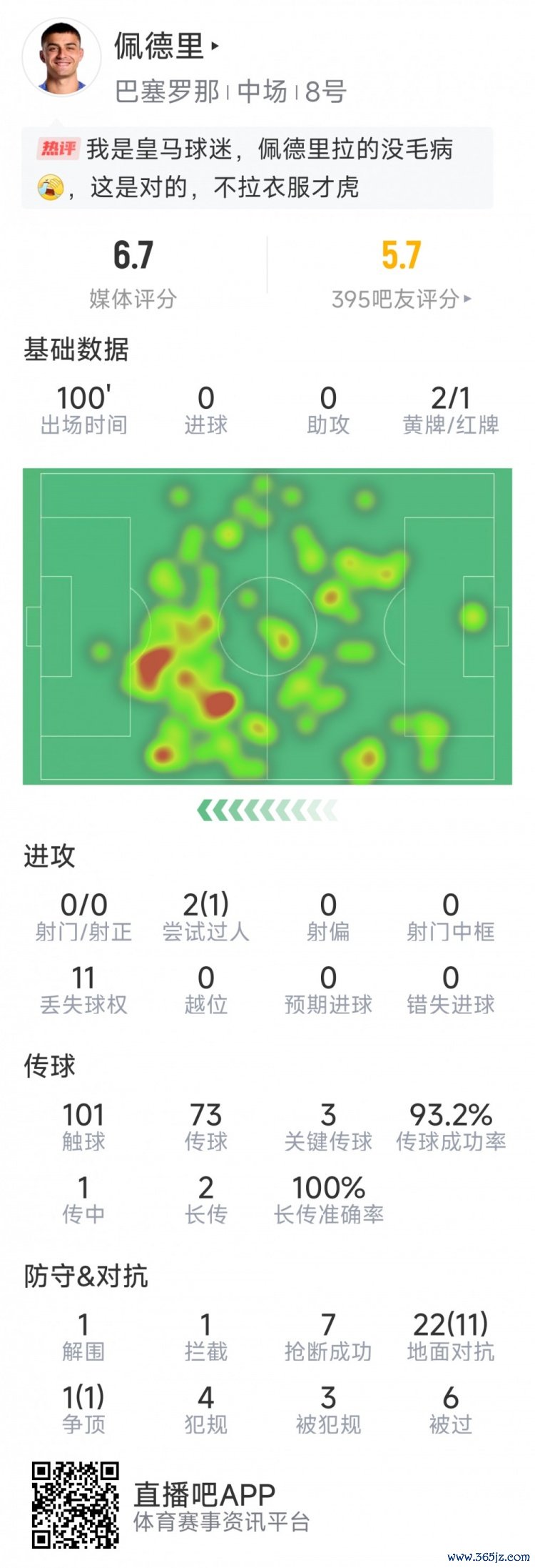 10月27日讯 在本轮西班牙国度德比,皇马2-1打败巴萨,佩德里在临了本领被红牌罚下,以下为他在本场数据: