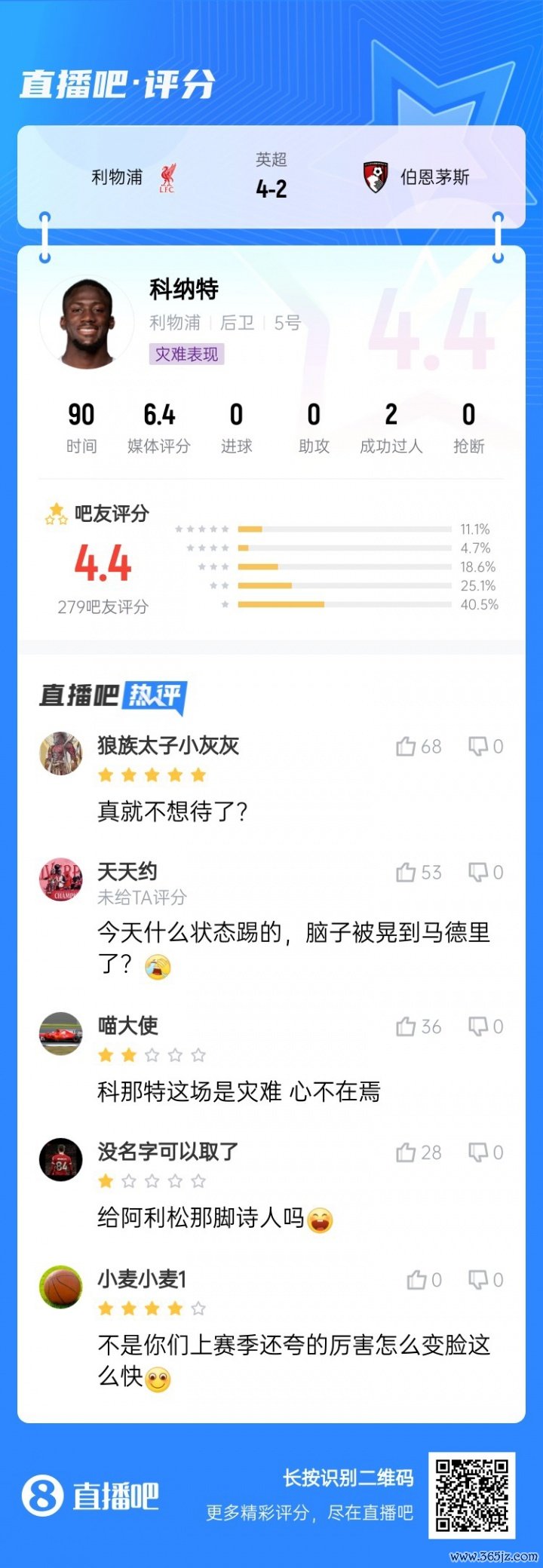 08月16日讯 利物浦英超揭幕战4-2打败伯恩茅斯,此役首发中卫科纳特发扬欠安,媒体评分6.4分,吧友评分全队最低4.4分。