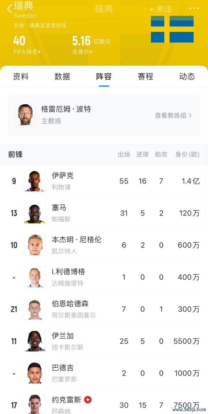 瑞典队声势总身价高达5.16亿欧,领有伊萨克、约克雷斯、伊兰加等球星,但世初赛一胜难求,1平4负仅积1分,只进了3球却丢了11球。托马森上月因灾祸战绩下课,波特接办后首秀却1-4惨败。