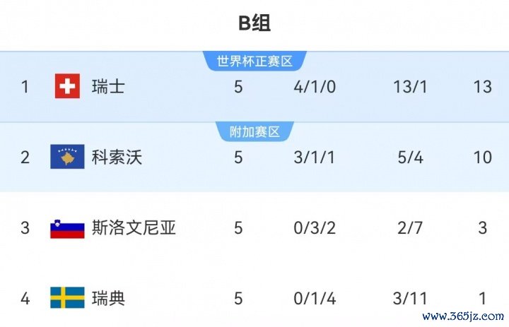 11月16日讯 世初赛欧洲区,瑞典1-4不敌瑞士,五轮仅积1分名次垫底。
