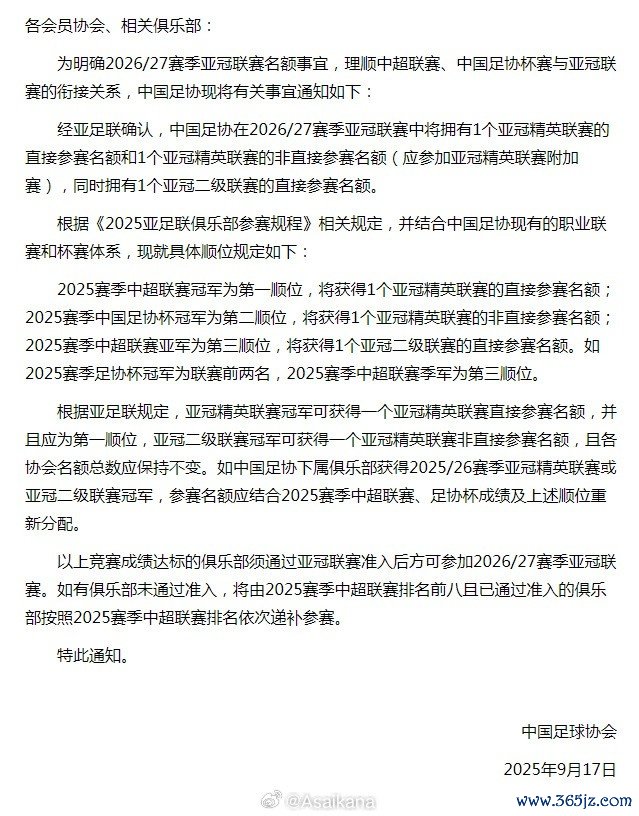 跟着中超斥逐,2026-27赛季亚冠联赛中国球队参赛经历也基本信赖了。下赛季亚冠起,中超是1+1+1个限额,中超冠军上海海港将径直干与亚冠精英联赛;中超亚军上海申花将干与亚冠二级联赛。另有一个亚冠精英联赛的附加赛限额是给本年足协杯冠军的,将由河南和北京国安于12月6日决出。