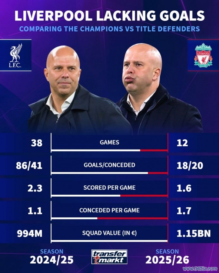 11月23日讯 英超第12轮比赛,利物浦主场0-3不敌诺丁汉丛林。德国转会市集统计了利物浦上赛季和本赛季的英超数据,并作念出对比。