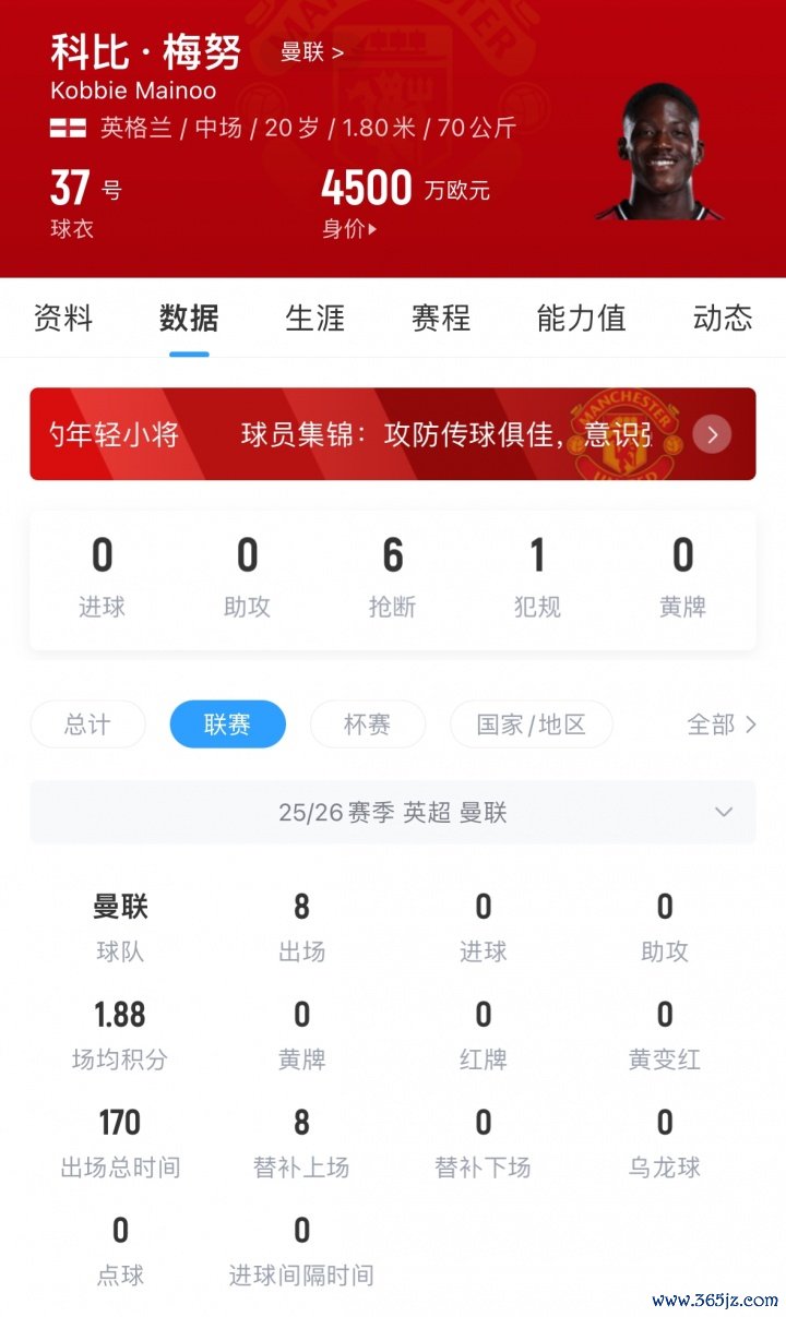 这是梅努本赛季英超的第8次出场,8次出场一说念为替补登场,且假想时长仅为170分钟。