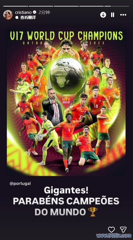 葡萄牙球星C罗在社媒为U17队奉上了祝颂,C罗转发了葡萄牙的夺冠海报,并配文:“巨东谈主!恭喜你们,天下冠军🏆”