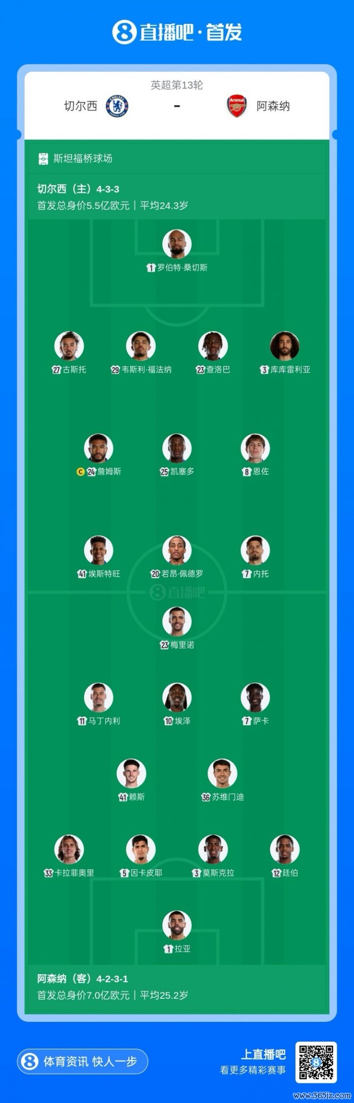 11月30日讯 英超第13轮,切尔西主场迎战阿森纳,赛前首发名单公布。【本场比赛两队中场凯塞多与赖斯正面交手,切尔西方面帕尔默复出镇守替补,阿森纳方面萨利巴磨练中受伤,缺席本场比赛】