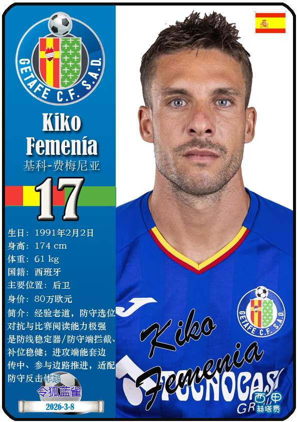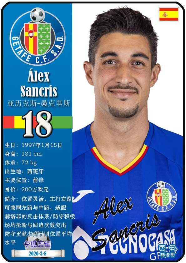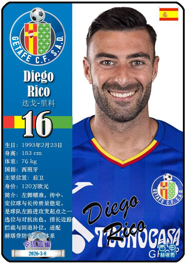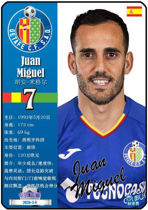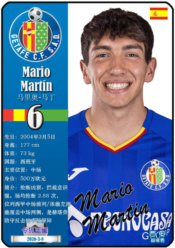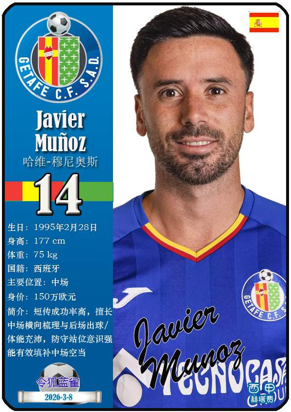 西甲赫塔费篮球足球球队组织成立于1946年,距今已有80年历史。目前队伍足球主教练是佩佩·博尔达拉斯,队内拥有选手马丁-萨特里亚诺、博尔哈-马约拉尔、胡安-米格尔等。本期以知名球员卡的形式展示截至2026年3月9日,西甲赫塔费篮球足球球队组织的24名选手(按运动员编号排序):