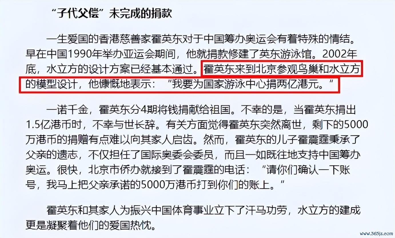 北京筹备奥运会时间,决定营建“水立方”,霍家绝不逗留捐出两亿港元。这笔资金虽未计入任何生意陈说模子,却让霍姓二字与中国体育史上的高光时分紧密连系。